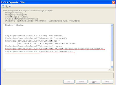The next thing that I need to do is set the URI for this dynamic logical port. If you look closely you will notice that my URI contains the "ftp" protocal identifier. So how does BizTalk know to use the NSoftware adapter or the Microsoft adapter? No, you don't have to uninstall the Microsoft adapter.